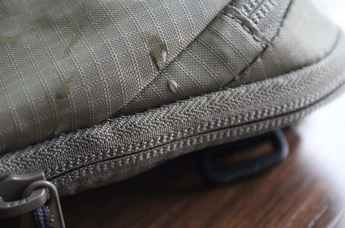 生地には撥水加工を施し、開口部には止水ファスナーを採用することで雨が降っても浸水しにくい作りをしています。