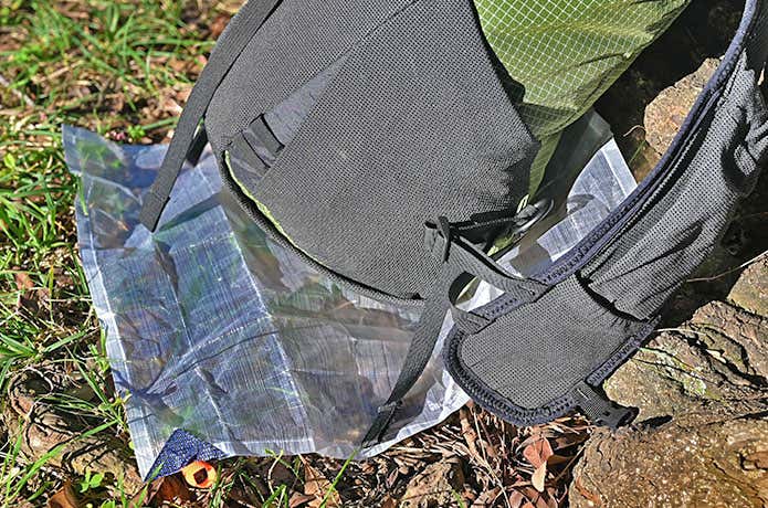 雨上がりや霜が降るほど冷え込んだ時など、登山時に地面が濡れている場合も多いですよね。そんな時にザックを下ろさずポケットからトレイルシートを取り出し、荷物を汚さないように敷くことが可能。