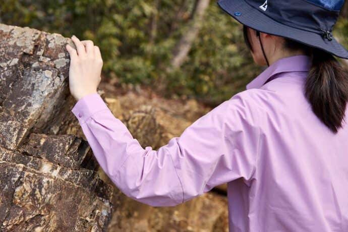 肘部分は立体構造の3Dカットで、岩場でバランスを取るために手を出すときや、バックパックから荷物を取り出すときにも、スムーズな動きやすさ。Tシャツやロングスリーブを着ていてもサッと羽織れます。
