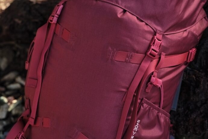 サイドのコンプレッションストラップは3本ずつ。グッと体に引き寄せる