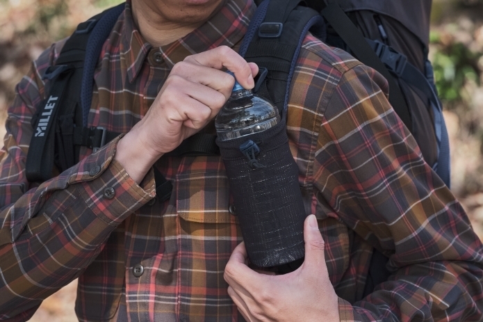 ショルダーポケットは左右に搭載。伸縮するメッシュ生地で作られていて、サイズは500mlまでのペットボトルがぴったり。