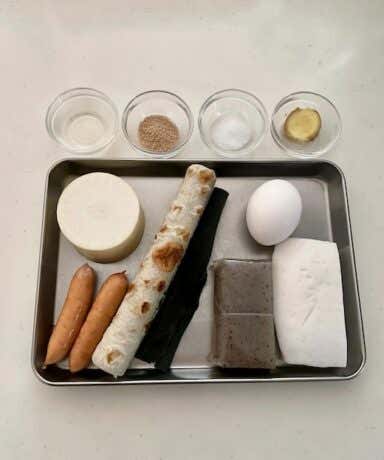 ①大根は皮ごと1cm程度の薄切り、ちくわとこんにゃくは斜め切り、はんぺんは食べやすい大きさに切る。しょうがは擦りおろす。