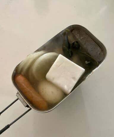 ②メスティンに具材を詰め、水200ml(分量外)、和風顆粒だし、塩、酒、しょうがを入れる。