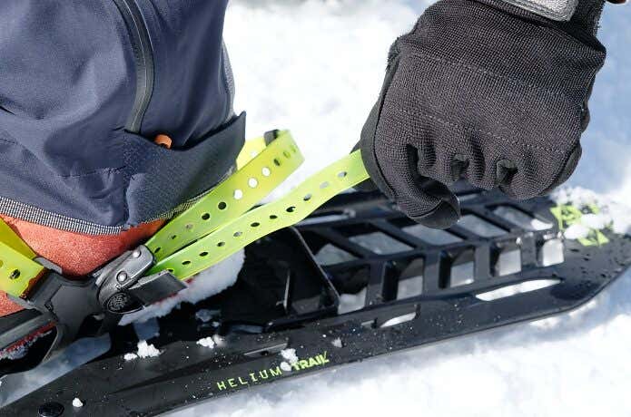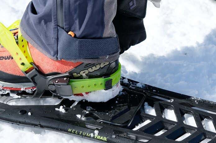 スノーシューを靴に固定するバインディング、その装着方式もモデルによって異なります。もっともオーソドックスなのはストラップを締めて固定するベルト式ですが、バックルを金具で締めるラチェット式、ワイヤーを締めるダイヤル式もあります。