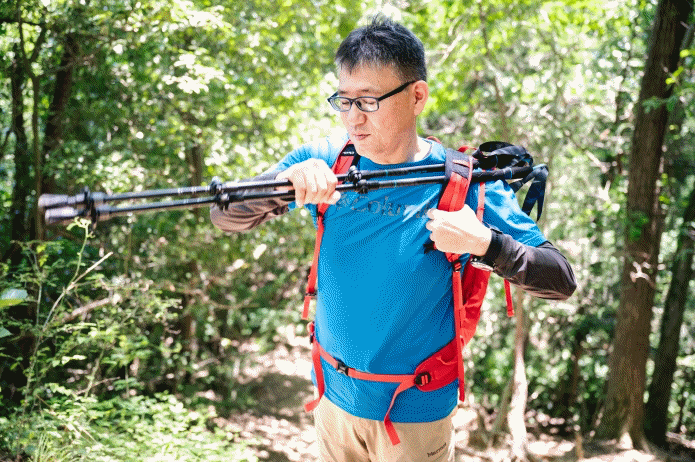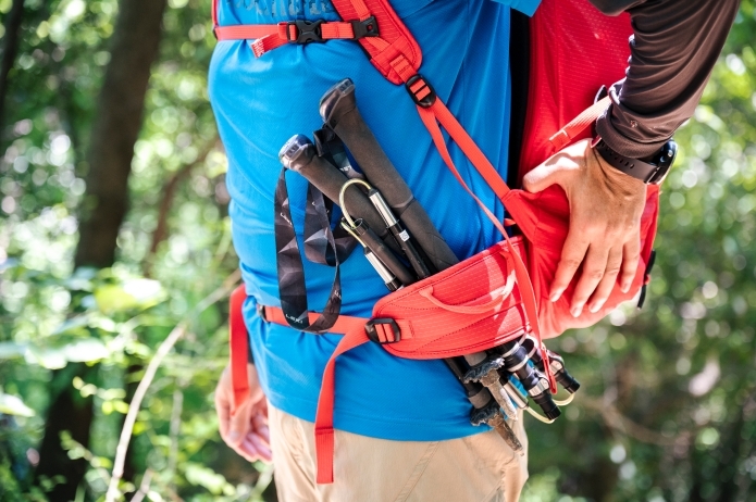 折りたたみ式を使っている場合は、ヒップベルトに挟んで運ぶこともできます。一時的にポールを使わないときはこの方法もあり。