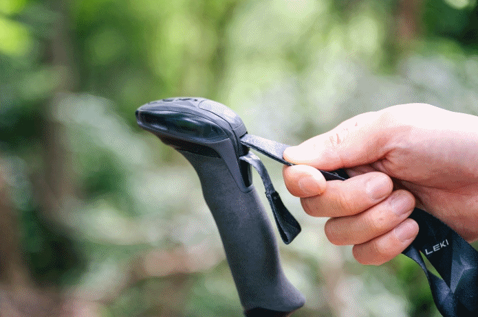 このとき、グリップは力いっぱい握らなくてOK。力を抜き、手首でストラップにぶら下がる感覚でトレッキングポールに力を伝えます。