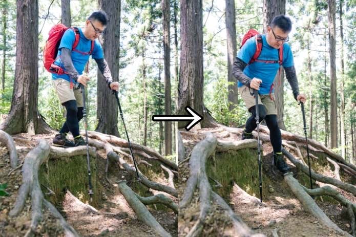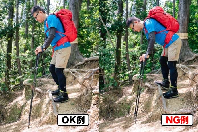 体より先行して段差の下にトレッキングポールを突きます。このとき、先行させたトレッキングポールに全体重を預けるのはNG。