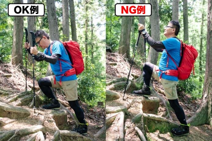 足を上げられないほど大きな段差では、トレッキングポールを使わずに手をついて通過するほうが安全です。