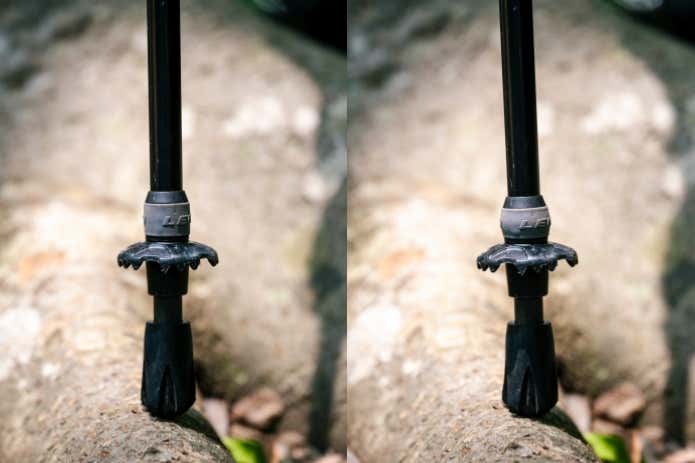 基本、体が前のめりにならずトレッキングポールを突ける長さ(写真左)が理想で、通常より5〜10cmポールを伸ばしてちょうどいい長さを見つけてください。