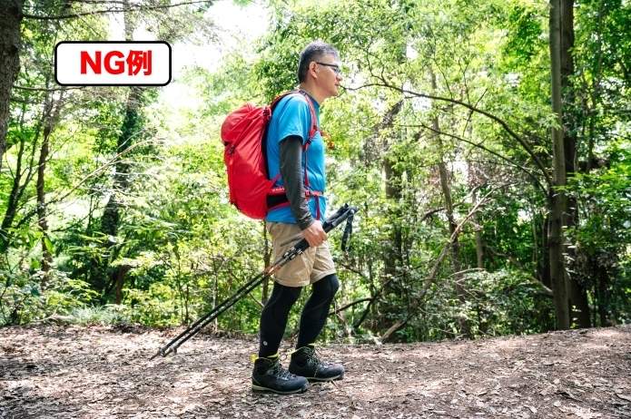 トレッキングポールを使わないとき、先端部を後ろに向けて持つと、手を振ったときに後ろから来る人に先端をぶつけてしまう危険性があります。
