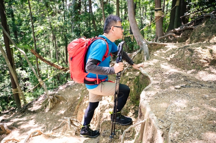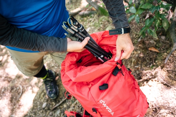 大きな段差が何度も続くようであれば、両手を使うためにトレッキングポールはバックパックの外に取り付けるか、完全に中に入れてしまいましょう。