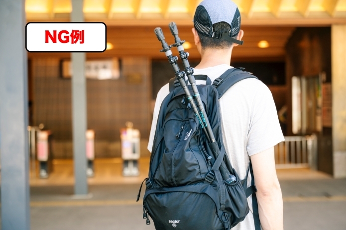 公共交通機関を使って移動するときも注意が必要です。写真のようにバックパックのサイドポケットに差し込んだ状態は、周囲にポールをぶつける可能性が高く非常に危険。
