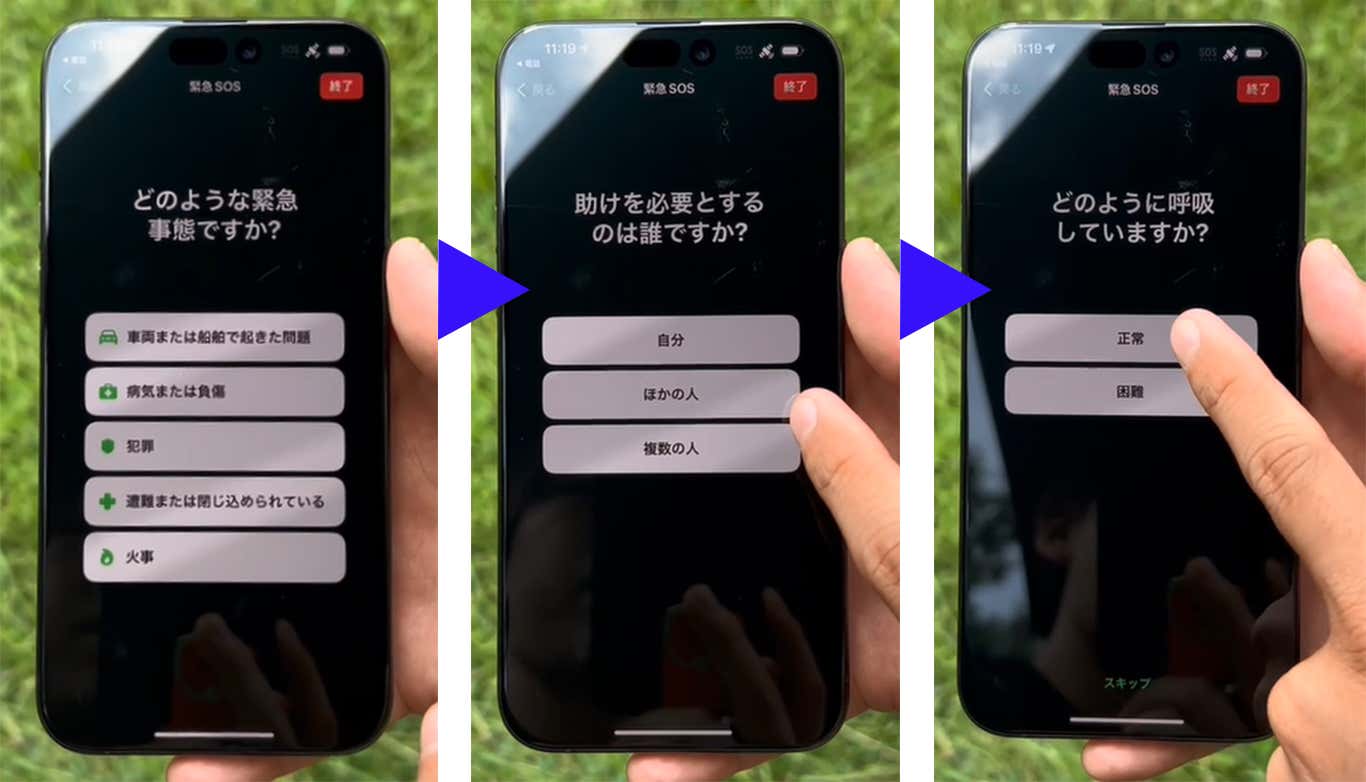 デモンストレーション用のiPhoneにて、「衛星経由の緊急SOS」サービスで通報する流れを体験をさせてもらいました。