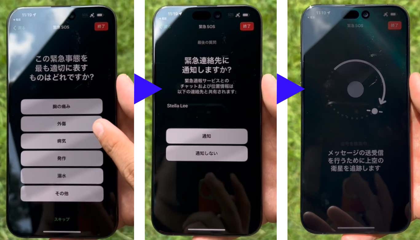 あらかじめ緊急連絡先を登録しておくと、緊急事態の状況を緊急連絡先にも通知可能。すべての回答が終わったら、メッセージを送信するために衛星を探します。