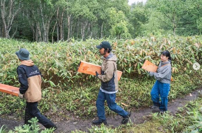 尾瀬国立公園の木道の長さは約60kmにも及びますが、木道に使われる木はたった5〜10年で腐朽すると言われています。木材をヘリで運び修繕するとなると莫大な費用と時間を要するうえ、環境への負荷もかかるため、このままでは木道を歩けなくなる日がくるかもしれないと言われています。