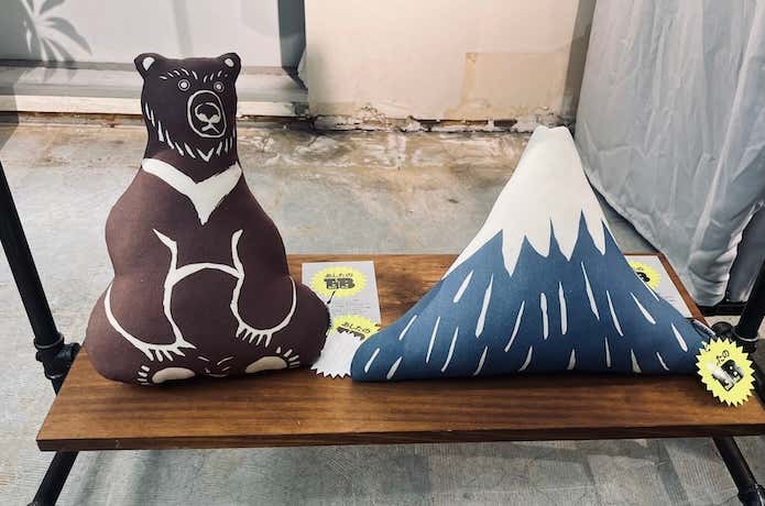 アーティストとのコラボレーションも精力的におこなっています。写真はアウトドアクリエイターのYURIEさんとコラボした「国立公園の明日をまもるクッション」。富士山と、その麓に生息し絶滅危惧種に認定されているニホンツキノワグマを象ったポップで愛らしいデザインが人気です。
