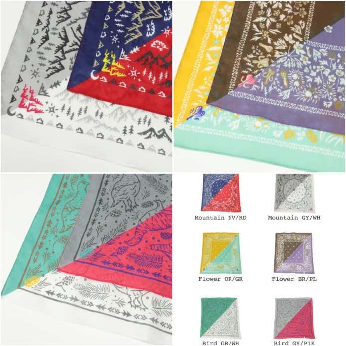 バンダナはコーディネートや気分にあわせて選べる全6種。連なる山々、咲きほこる植物、雷鳥など、山にまつわるモチーフをデザインに取り入れています。目を惹く配色と相まって、山好きなら思わず欲しくなるデザインです。