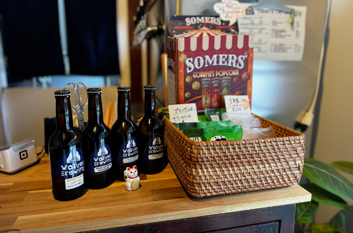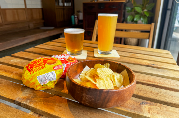 店頭では、ビールに合う軽いおつまみなどを販売。取材したその日は、ポテトチップスのほか、ポップコーンやバームクーヘンなどが並んでいました。
