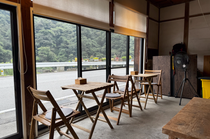 お店に入ってすぐの土間にあるテーブル席。窓の向こうには、緑豊かな奥多摩の大自然が広がります。