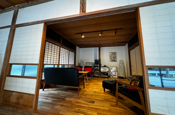 ロゴマークが大きく描かれた藍色の店頭幕が目印。建物自体は、1955年に建てられた商家をリノベーションしたもので、味わいあるたたずまいです。