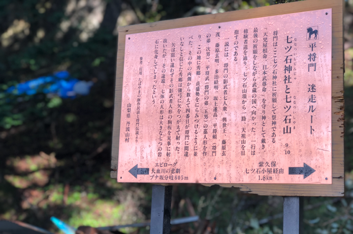 平安時代中期に平将門が逃げ延びてきたという言い伝えがあり、七ツ石山までのルート上ではそれら伝説の痕跡に触れることができます。