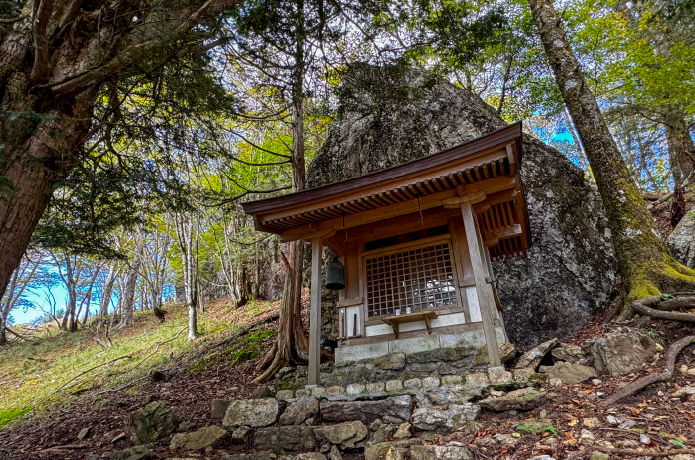 山頂直下にある七ツ石神社。狼信仰の神社だけに、社の中には狼の狛犬を見ることができます。また、神社の背後には七ツ石山の由来にもなっている、七つの大岩が連なります。