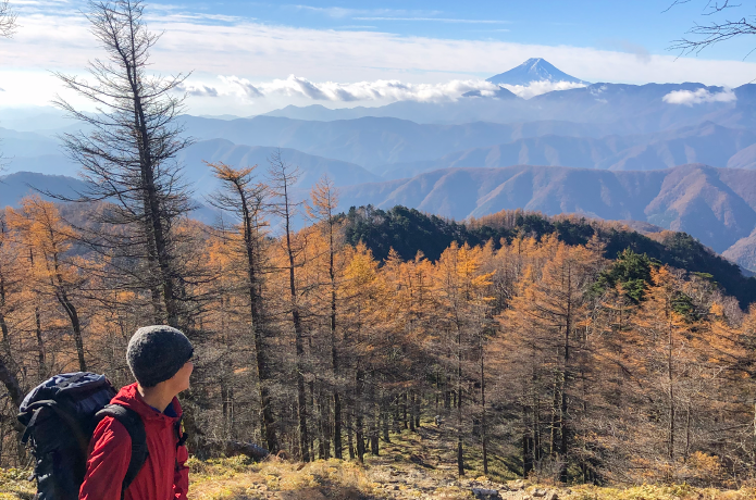 雲取山へと続く美しい稜線を望むことができる七ツ石山山頂。新緑や紅葉はもちろんのこと、冬季には積雪することもあり、四季折々の自然が楽しめます。