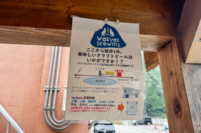 今回はピストン山行なので、スタートもゴールも鴨沢バス停に。バス停内には、今回もうひとつの“いただき”であるWolves Brewingの案内が出ています。