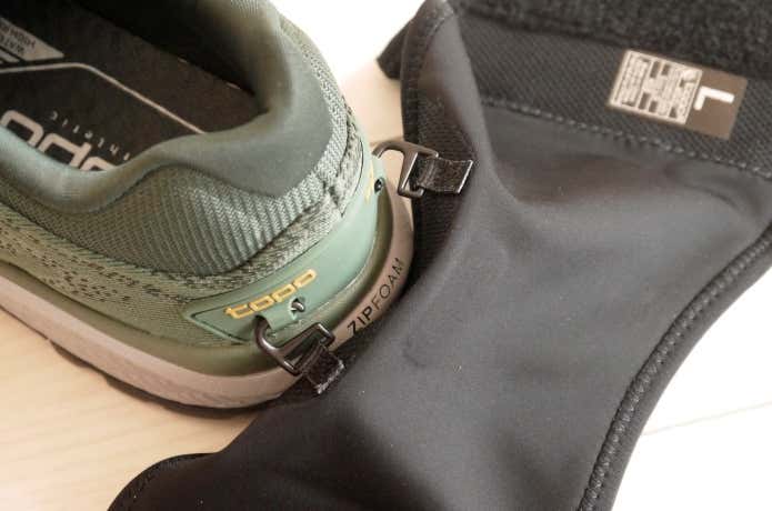 トポアスレチックのトレイルシューズの全モデルには、別売のパフォーマンスゲイター(6,050円)を固定するフックを装備。ローカットシューズにおこりがちな土や小石、小枝の浸入を防げます。多少の雨や露も弾いてくれ、濡れによる冷えも予防。面テープでフィット感を調節、着脱も簡単です。