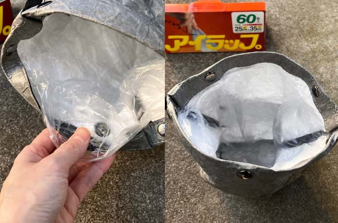 まず、中にゴミを溜める袋を取り付けます。スナップボタンでとめるだけのわかりやすい構造。なお、ポリ袋はアイラップとポリ規格袋No.12(幅230mm×高さ340mm)に対応しています。