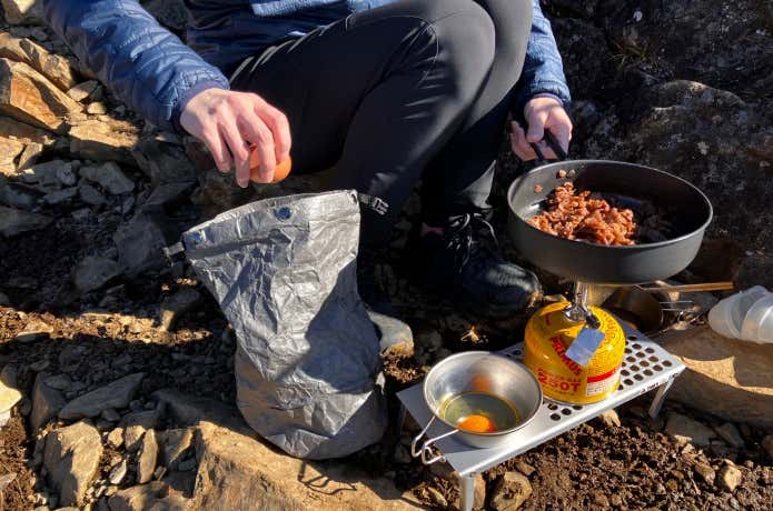 休憩時には肉や卵を使用してしっかりと調理。その際、自立するのでゴミ箱に捨てるときのように、片手でさっとゴミを捨てられ、調理する手を止める必要がありませんでした。地味にありがたいポイントです。