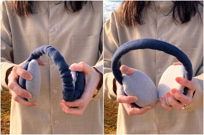 手のひらサイズのまるい形から耳の部分を両手で持ち、くるっとひねればあっという間にイヤーウォーマに変身。ヘッドバンドは伸縮するので、しっかり耳と頭に合わせることができ、ズレたり上に浮いてくることを防いでくれます。