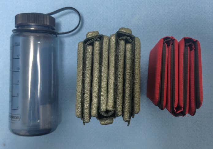 モンベルのほうが使用サイズが小さく薄いので、収納サイズも小さくなります。一方、重量は圧倒的に19gのダイソーのほうが軽量。とはいえ、モンベルのパッドも55gしかないので、携帯性という意味では五分五分でしょうか。