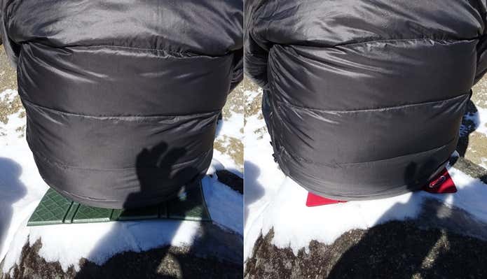 座った瞬間、はっきりと素材の違いが。ダイソーのほうは柔らかでクッションの上に座っている感覚ですが、モンベルのほうは硬めで板の上に座っている感覚。とはいえ、快適性に大きな差は感じず、雪の冷たさも感じません。