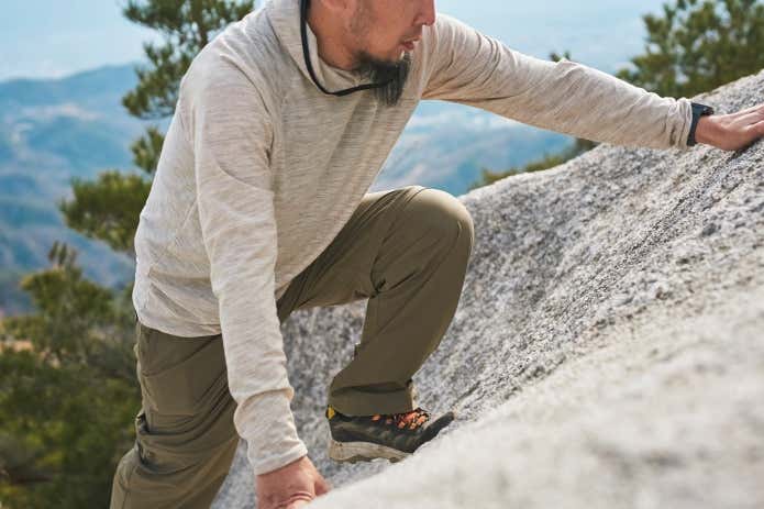 パンツの生地には4wayストレッチ生地を採用しているので、段差の大きい場所や岩場でもスムーズに足をあげられます。