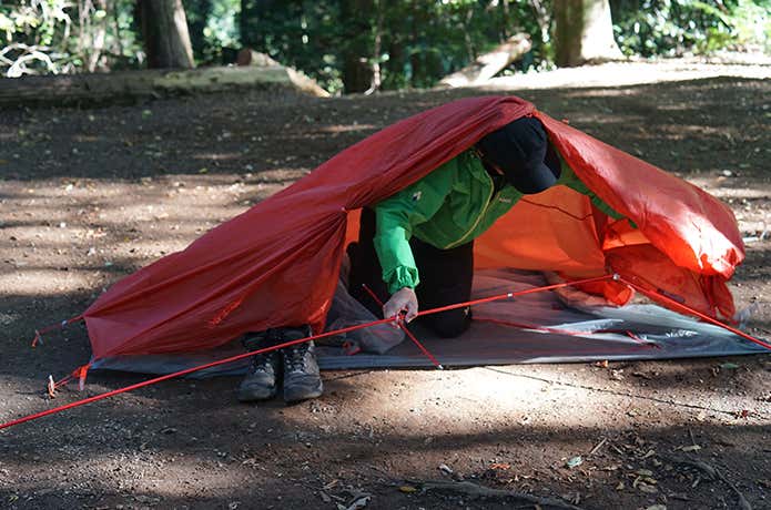 雑に体重をかけるとフライシート内側の防水コーティングが傷むので、注意深く!