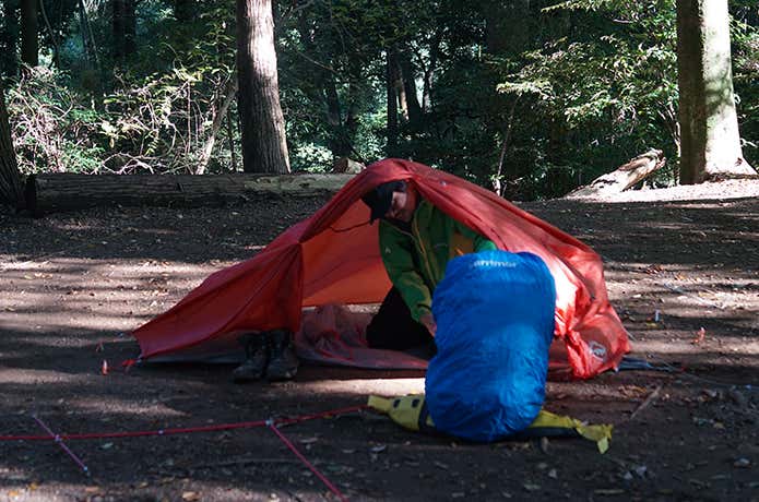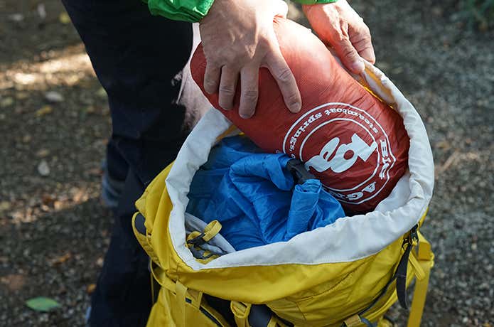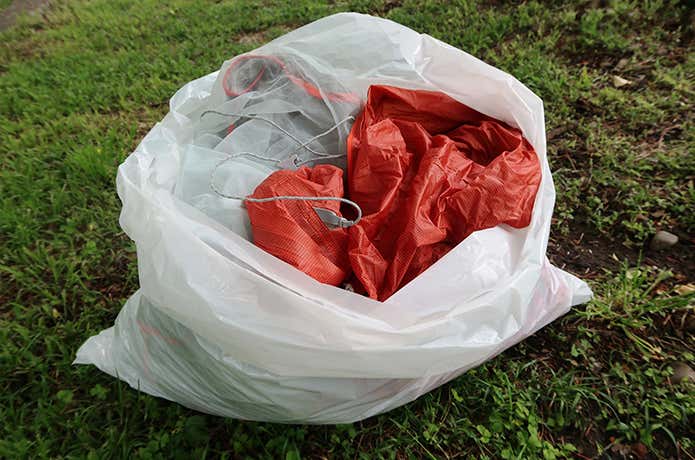 それに対して日本メーカーにはきれいにたたまないと入らないスタッフバッグが多いため、別の袋を用意しておくといいでしょう。大きめのドライバッグがベターですが、30Lくらいの丈夫なゴミ袋をつねにテントといっしょに持っていくと重宝します。
