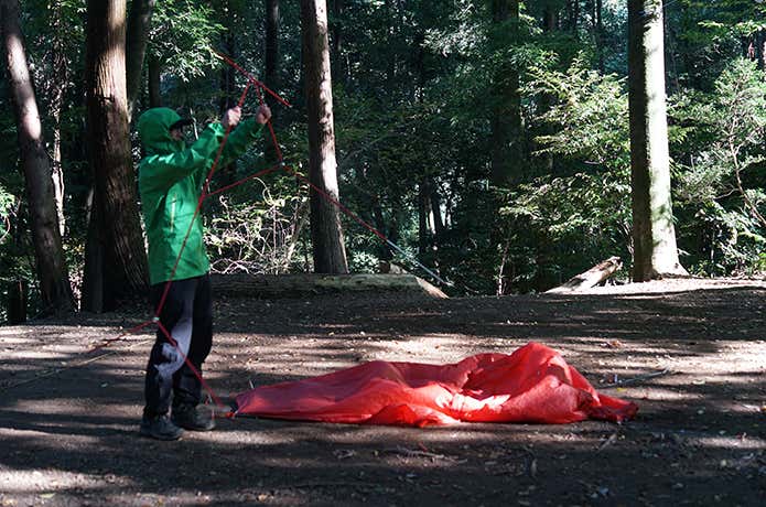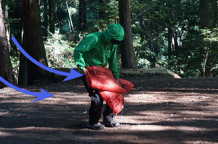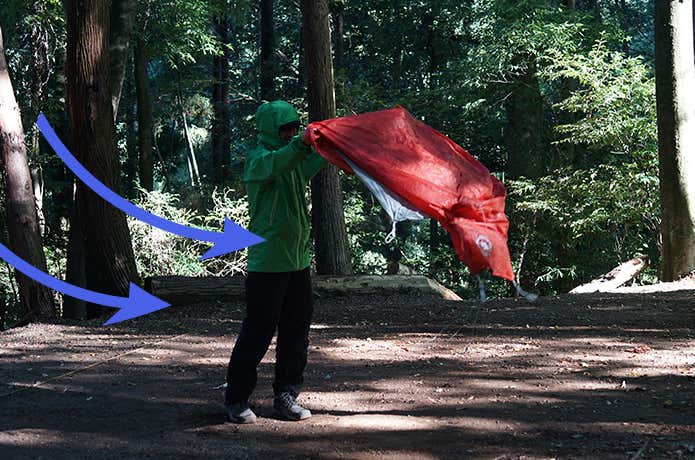 風上からフライシート中央部を持ち、そのまま立ち上がります。