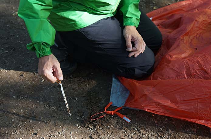 周囲に落ちている石や岩を上に置いて吹き飛ばないようにすることもできなくはありませんが、ゴツゴツした岩はフライシートへ簡単に穴をあけてしまうため、あまりお勧めはできません。