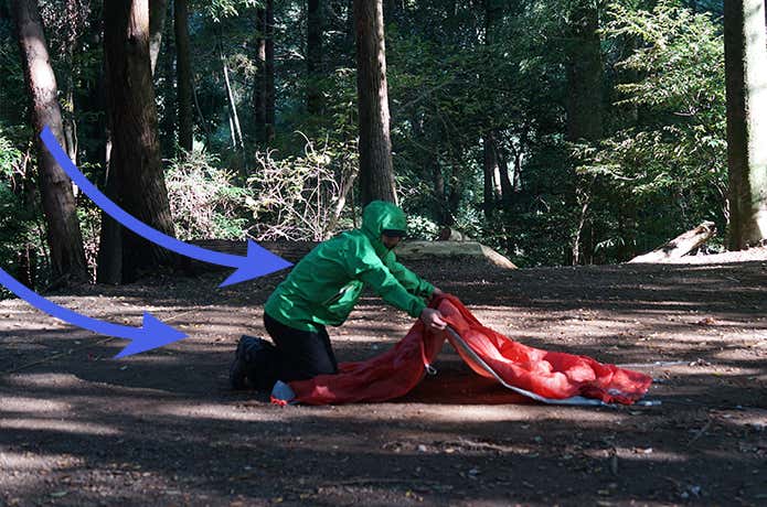 フライシートを外してからインナーテントをたたもうとすると、インナーテントの濡れていなかった部分までが雨で濡れてしまうため、フライシートが立体的な状態で雨を防いでいるうちに、その内部でインナーテントをたたんでしまうというわけです。