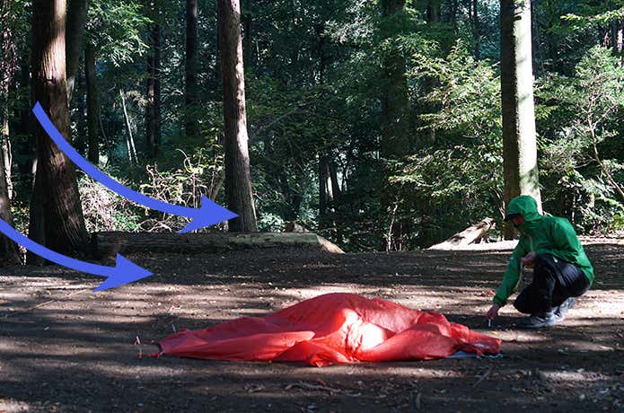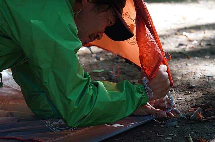 風向きが急に反対になることも想定し、ペグを抜くときは膝などで体重をかけてフライシートをつねに押さえつけておきましょう。