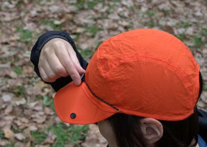 持ち運びに便利なだけでなく、実用性も優れています。吊り下げ用のコードは、被った際にフィット感を調節するアジャスターに。前側で調節できるので、急な風にもサッと対応できます。