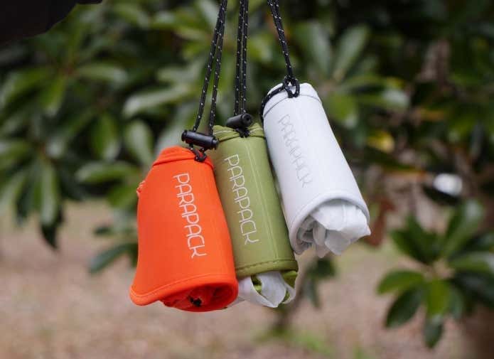建築デザイナーと工業デザイナーであった2人が、パラシュートの機構にヒントを得て作った独自のギミックにより、小さく折りたたんで、付属のコードでザックなどにぶら下げることができます。