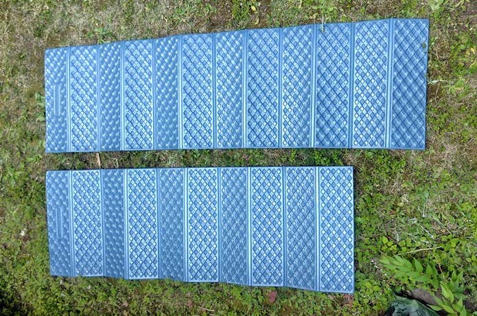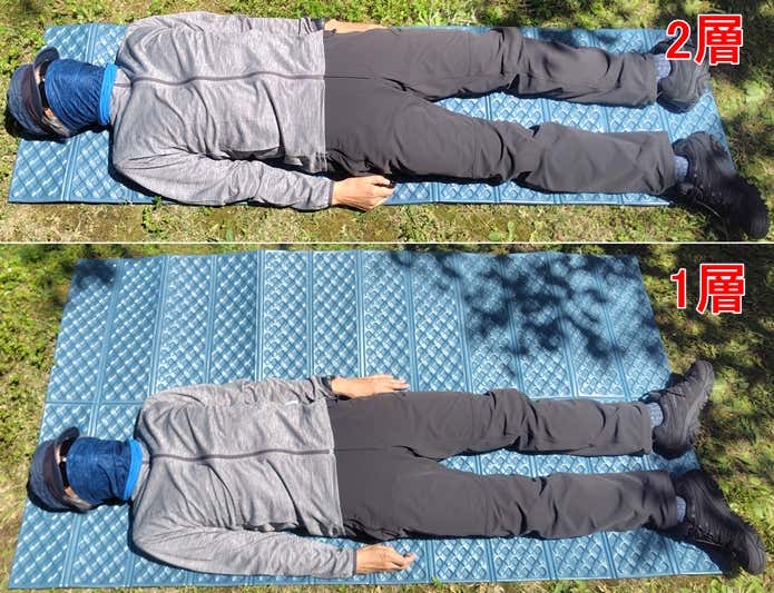 2層の場合は十分な厚さがあり、フカフカで地面の突起や固さをあまり感じません。一方、1層の場合は薄くなった感じが否めず、少々地面の起伏を拾います。