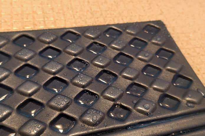 素材は水を吸収しない疎水性素材。表面は撥水するので、水に濡れても振り払って軽く拭き上げるか、少しの間、乾かせば問題なさそうです。