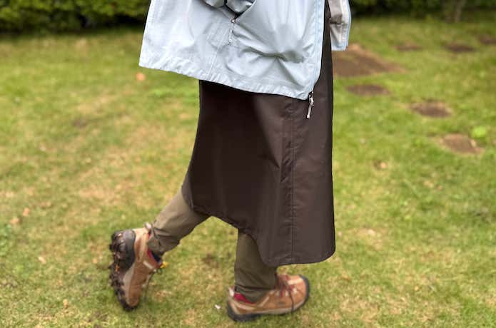 着用したままアクティブに活動することを想定するなら、膝下丈で「動きやすさ」を重視しましょう。膝がしっかり隠れるくらいの長さが、脚を雨から守りつつ、脚を大きくあげたときに裾を踏んでしまわない、ちょうどよい丈感です。