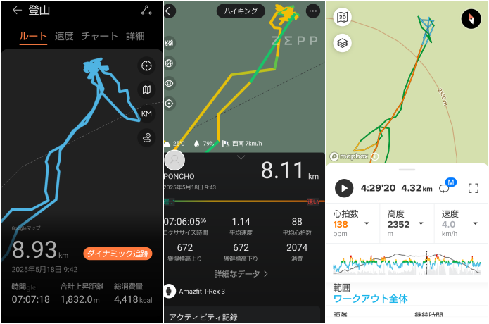 上画像は、新作のファーウェイウォッチ・FIT 4 Pro(左)、T-Rex3(中)、スント・レースS(右)の3台のGPSウォッチを浅間山外輪山・黒斑山~蛇骨岳を登山した時の記録です。いずれも、マルチ衛星捕捉デュアルバンド受信の高精度なGPS機能を装備しています。