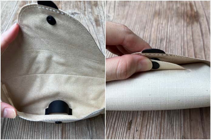 スナップボタンや開口部から水が侵入する可能性があるため、「濡れてもすぐ拭ける・ちょっとの雨はOK」くらいの気持ちで使うのがベスト。