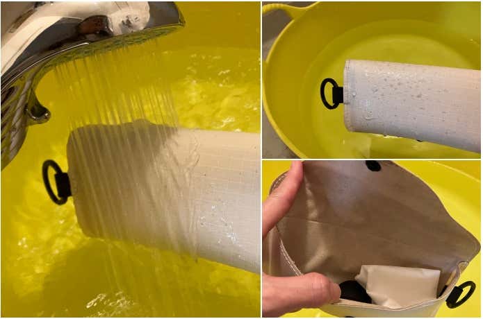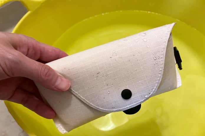 試しに中にティッシュを入れてシャワーを30秒ほどかけてみましたが、中に染み込んでいくこともなく、多少の雨なら問題なく凌いでくれそうです。濡れた手で扱っても染み込みにくく、安心感があります。