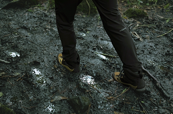 アウトソールのラグ(凸凹した突起)が太くて深いパターンのため、やわらかい土やマッドな登山道にも食い込んでグリップしてくれました。ラグの間に泥が詰まることもなく、ぬかるみの通過後でもグリップ力はそのままで行動し続けられます。
